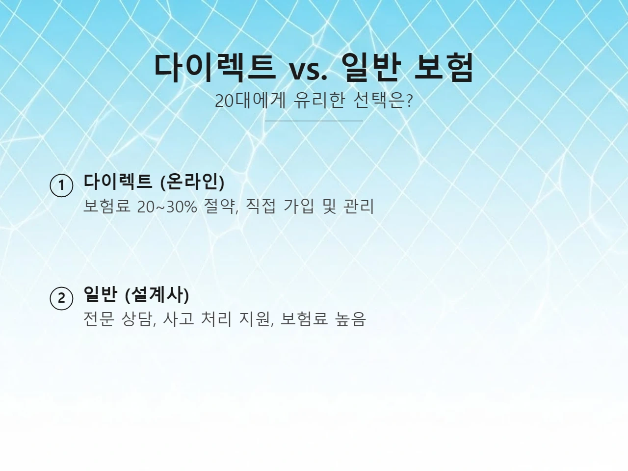 - 다이렉트 보험은 저렴하지만 비교/관리까지 직접 해야 해요.